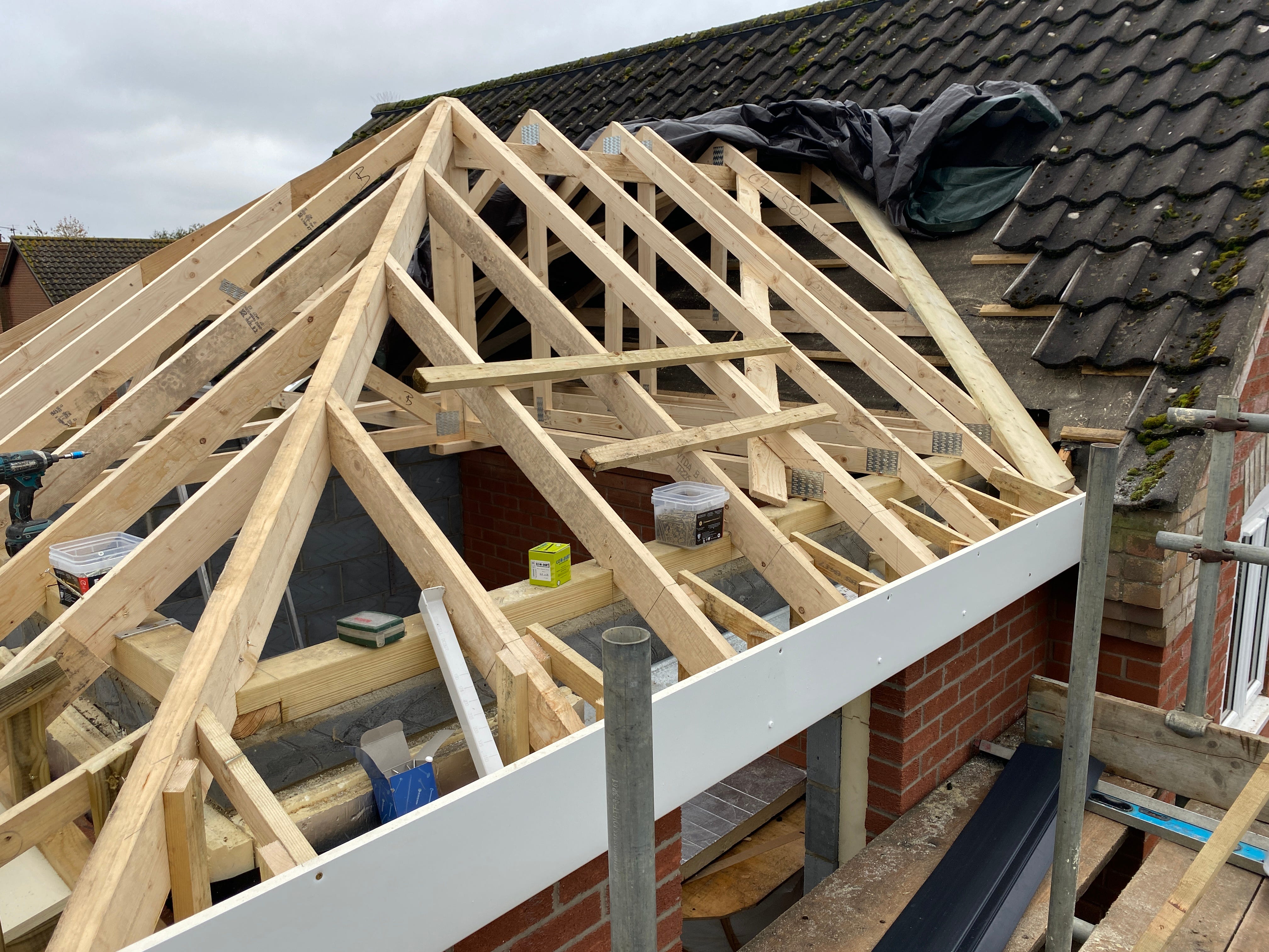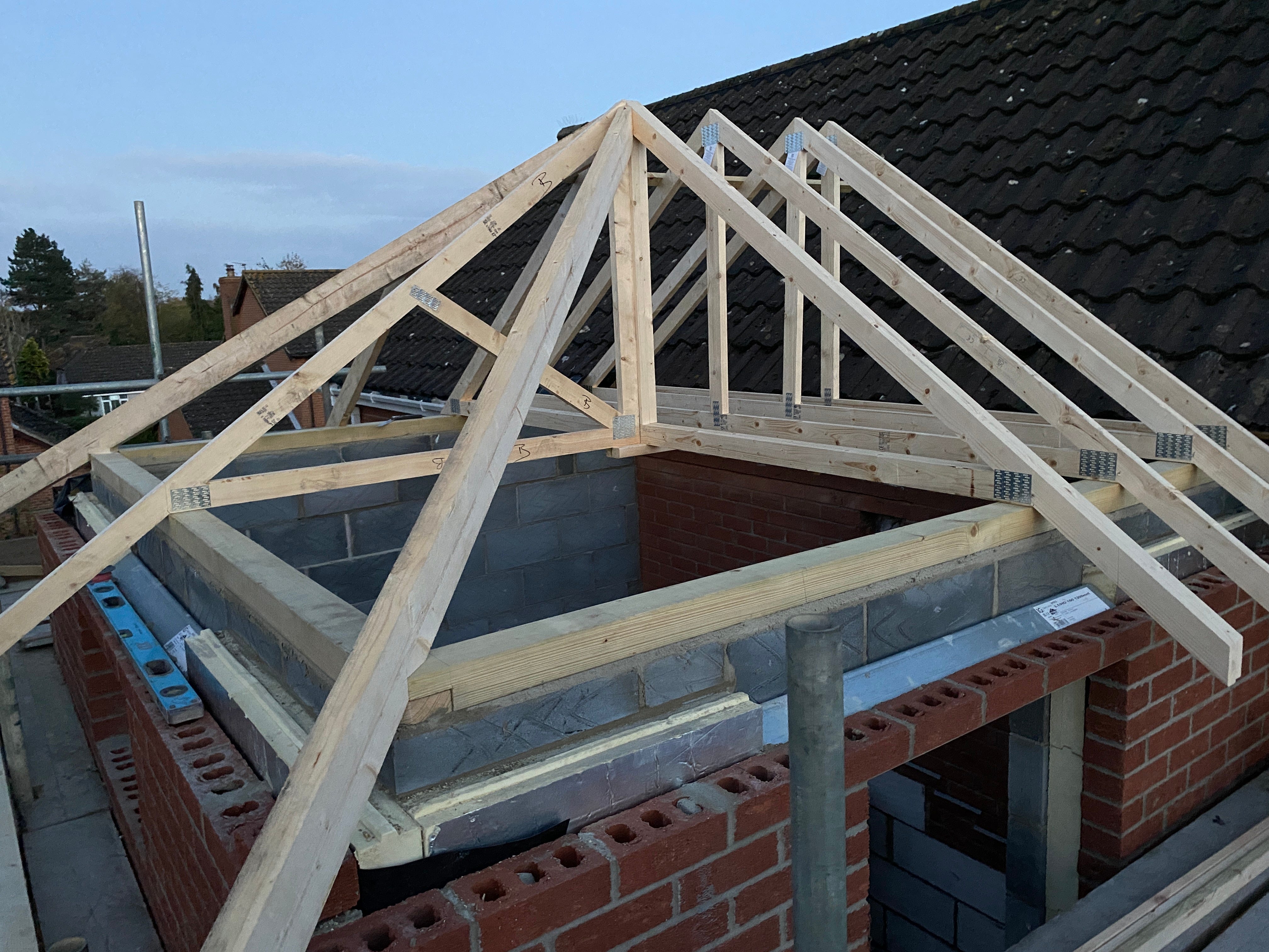 With the main roof trusses positioned, it was now time to lift up tiles from the roof of the house so we can blend into our existing roof. Smaller roof trusses have been used for this part.