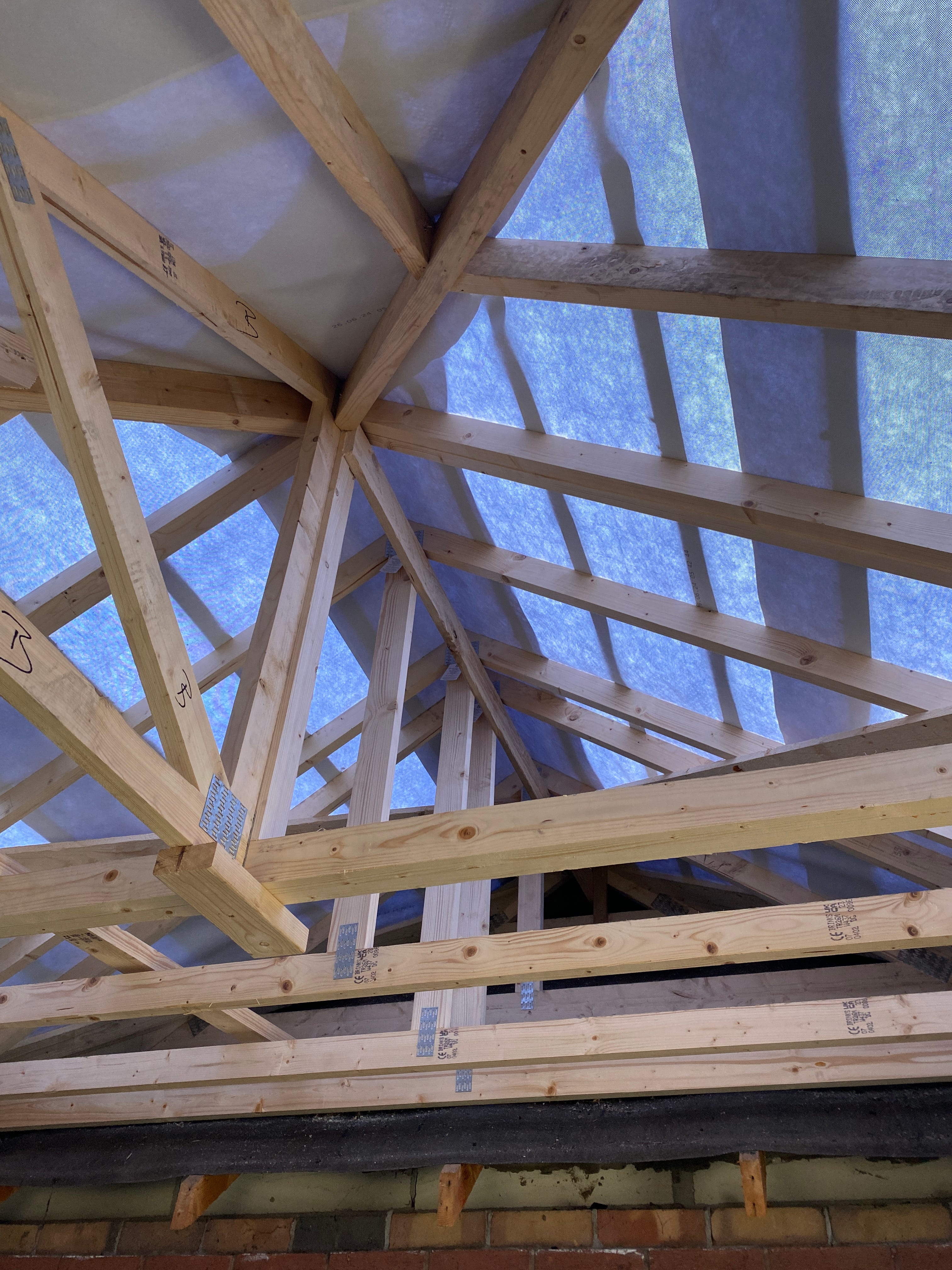 Where the roof trusses connect into the existing roof, new felt has been laid under the old felt to ensure we’re fully protected, and it’s now all battened so there is no risk of any water getting through.