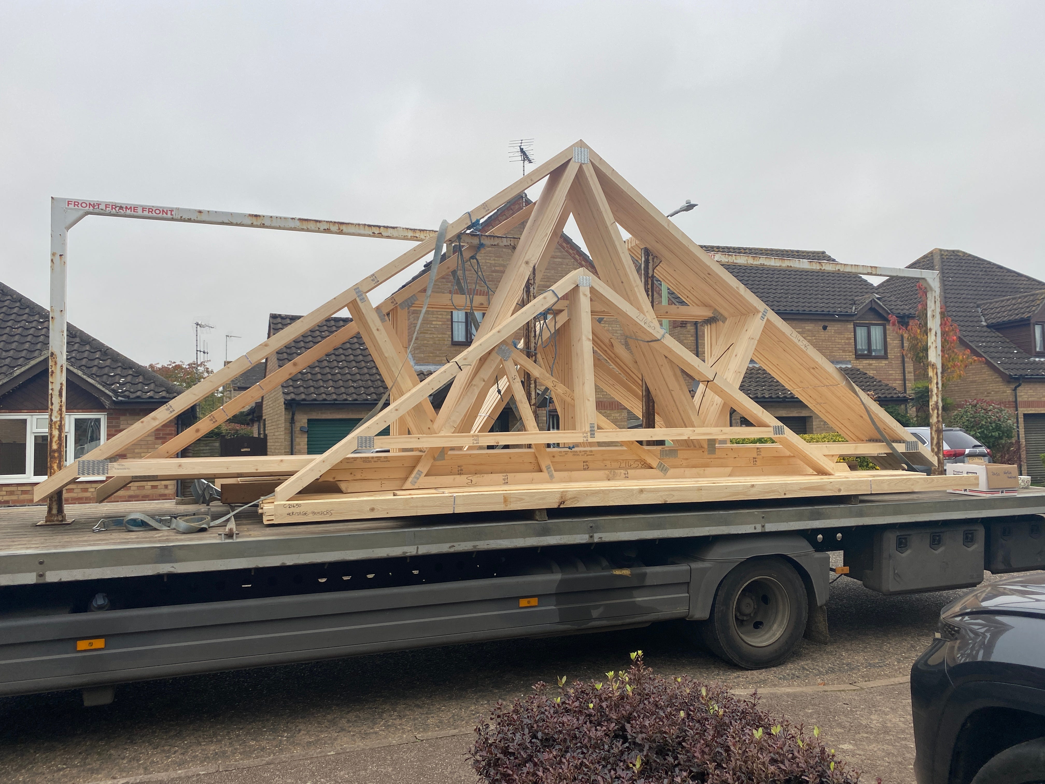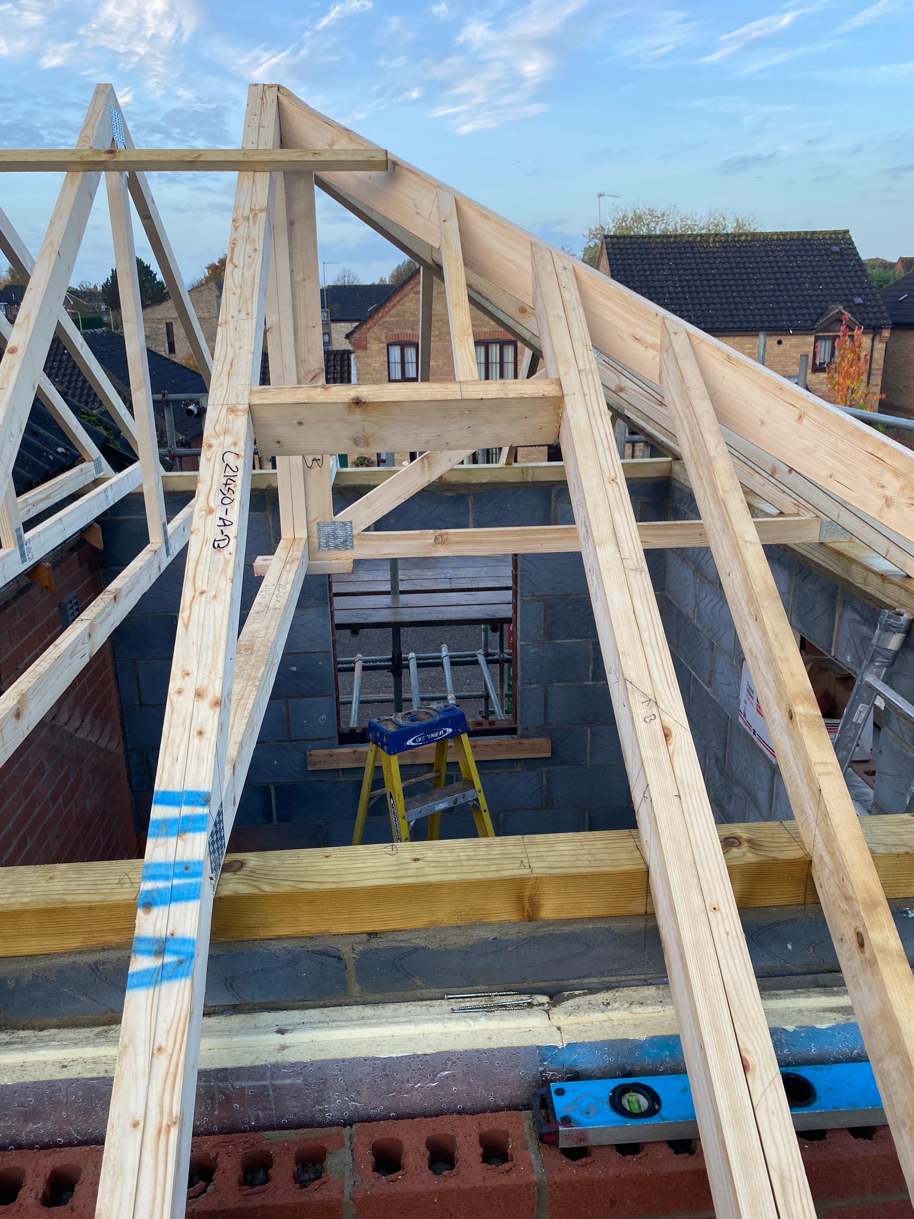 I have to say I wasn’t expecting to be lifting roof trusses up to the top of the extension on my day off (it was the other half’s birthday weekend and I’d taken a couple of days off to enjoy a long weekend of birthday celebrations). However, as the other half had to work, I stepped in to help our builder get them in position ready for putting up on Monday.